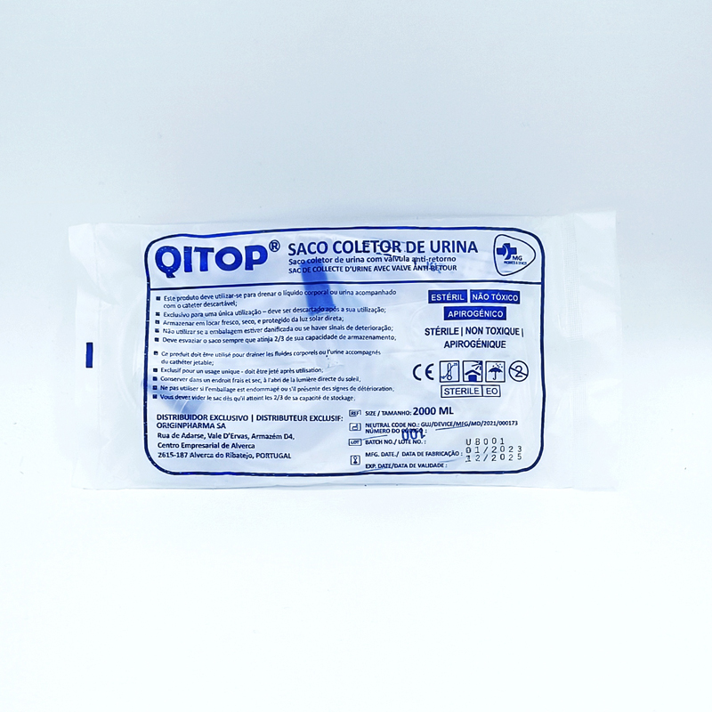 - Sac de collecte d'urine jetable et stérilisé de 2000 ml avec valve de non-retour.